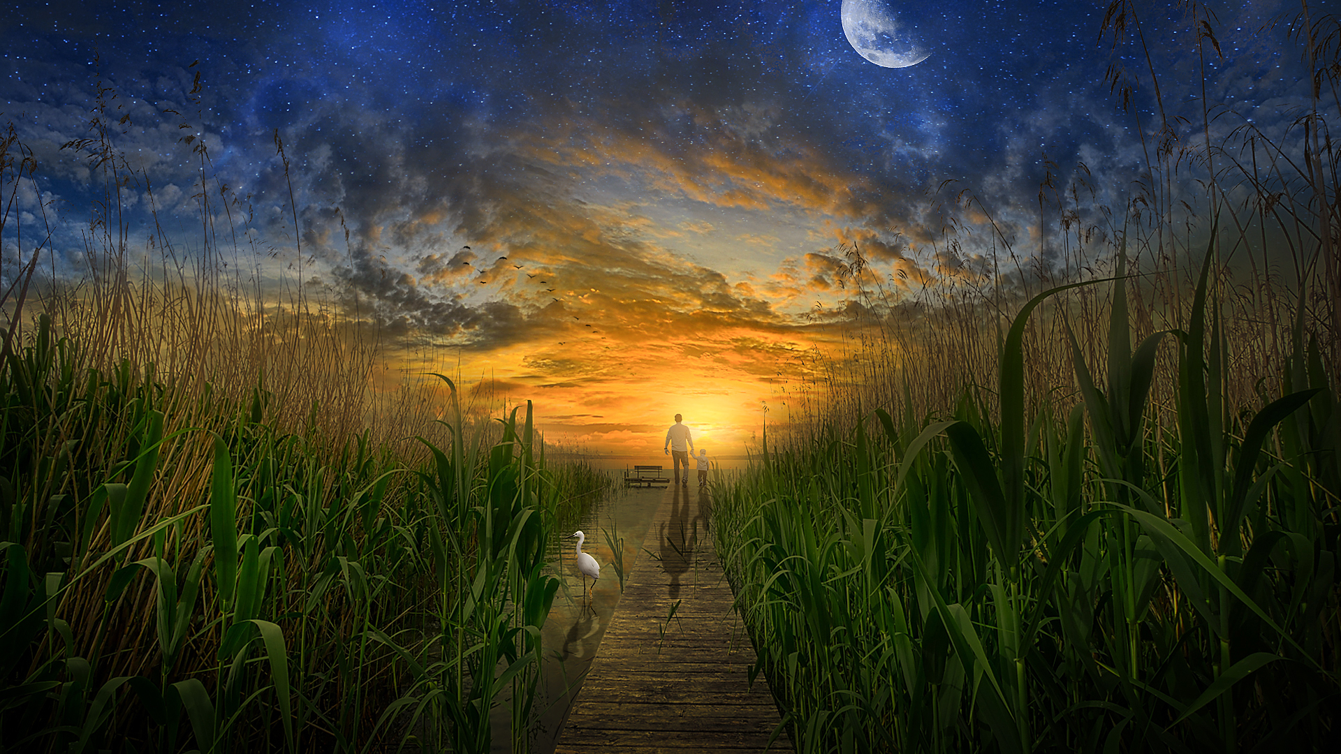 Background Crane Night Sky Moon People Sky Birds Brush