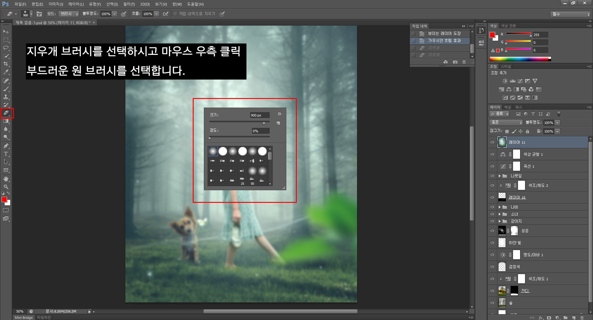 클릭해 브러시 선택창을 여시고 첫 번째 부드러운 원 브러시를 선택합니다.