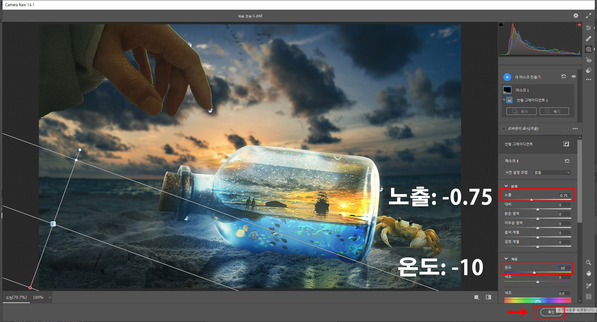 우측의 목록에서 [노출], [온도] 값을 적용해 주신 후 확인을 클릭해줍니다.